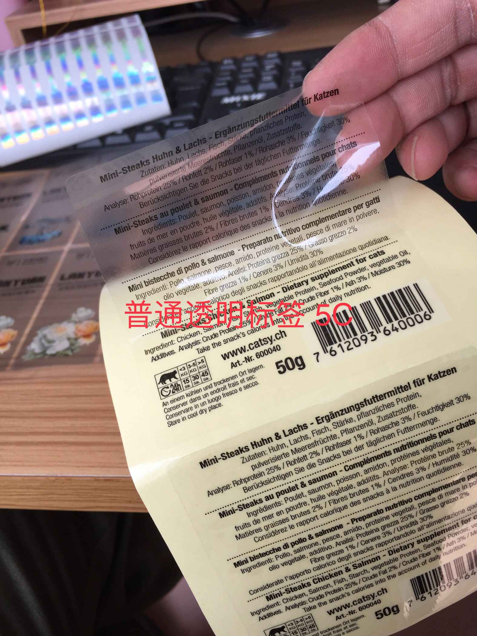 透明标签 透明不干胶具有以下特点:防水性能好、可以透出底色、可以把印刷品贴在透明材料的背面,提高 性。透明不干胶可以做镜像印刷, 上白墨,感觉就像把图像印刷在胶水面,适合贴在透明物体内面如玻璃、镜片等